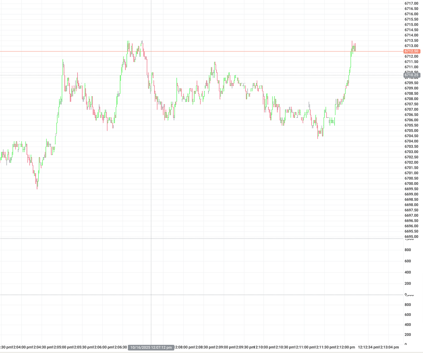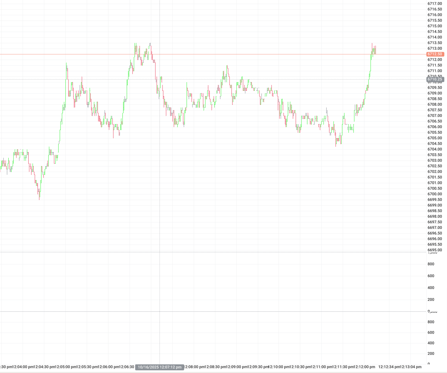 You can visibly detect a tempo shift here — the tape transitions from reactive drift to structured, upward rhythm. The bars compress, the pullbacks become shallower, and the volume profile thickens around 6700–6712, forming a stabilizing node.