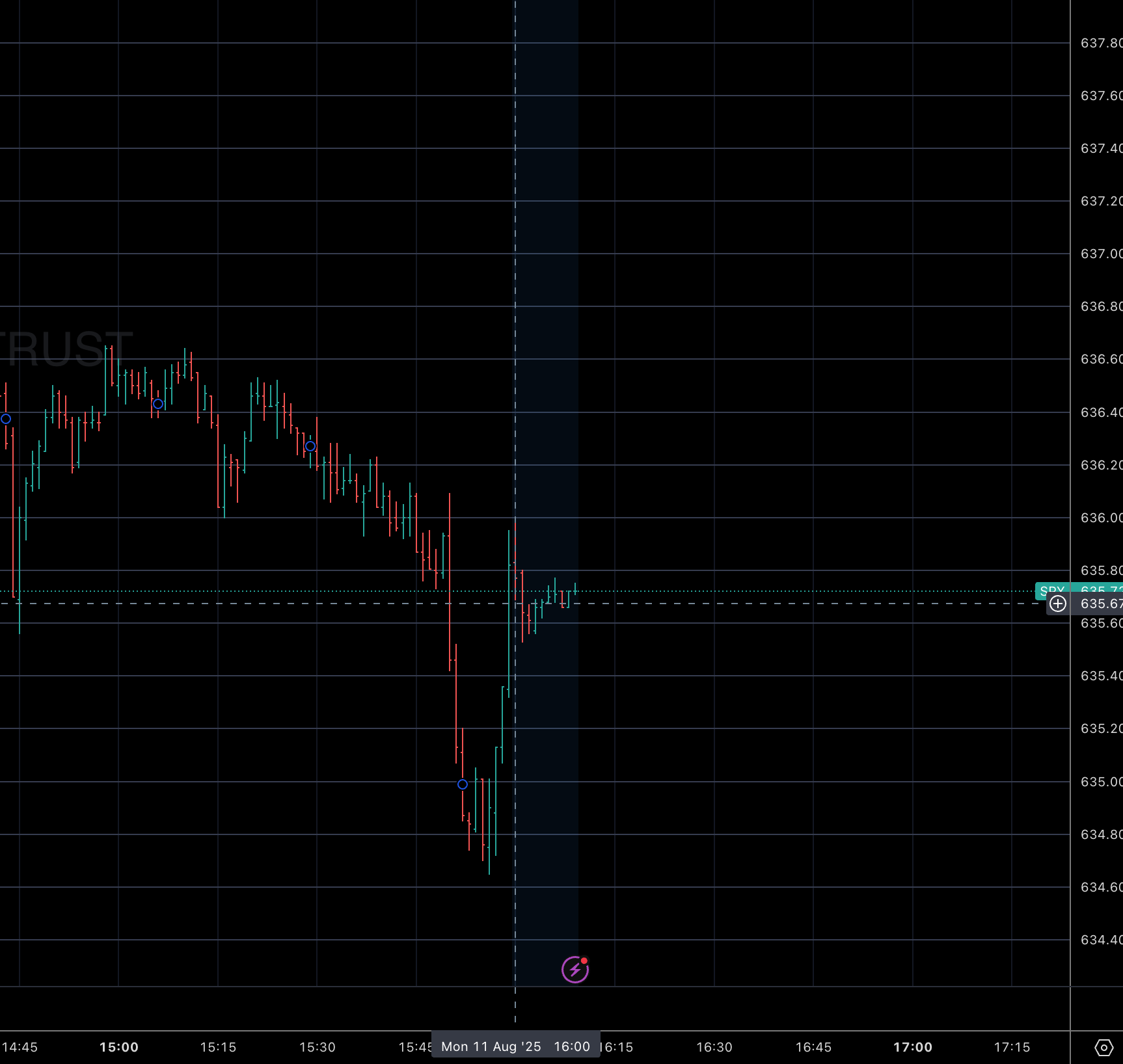 When the imbalance hit later in the day, the market chose to press through that anchor, triggering a fast, one-sided sell program into the close. On the tape, you can see how volume surged and price accelerated once that earlier low gave way — it was the path of least resistance.