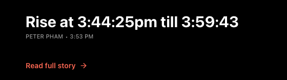 correction: Rise @ 3:55:25pm till 3:59:43Peter PhamJan 05, 20267ShareRise at 3:44:25pm till 3:59:43Peter Pham·Jan 5Read full storyThe time stamp was 3:53pm for 3:55:25 till 3:59:43. I would never backdate a time stamp. A work of art 245/271Peter Pham·Jan 5Read full storyPreviousNext