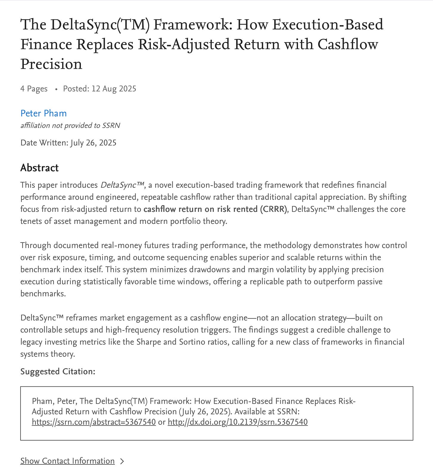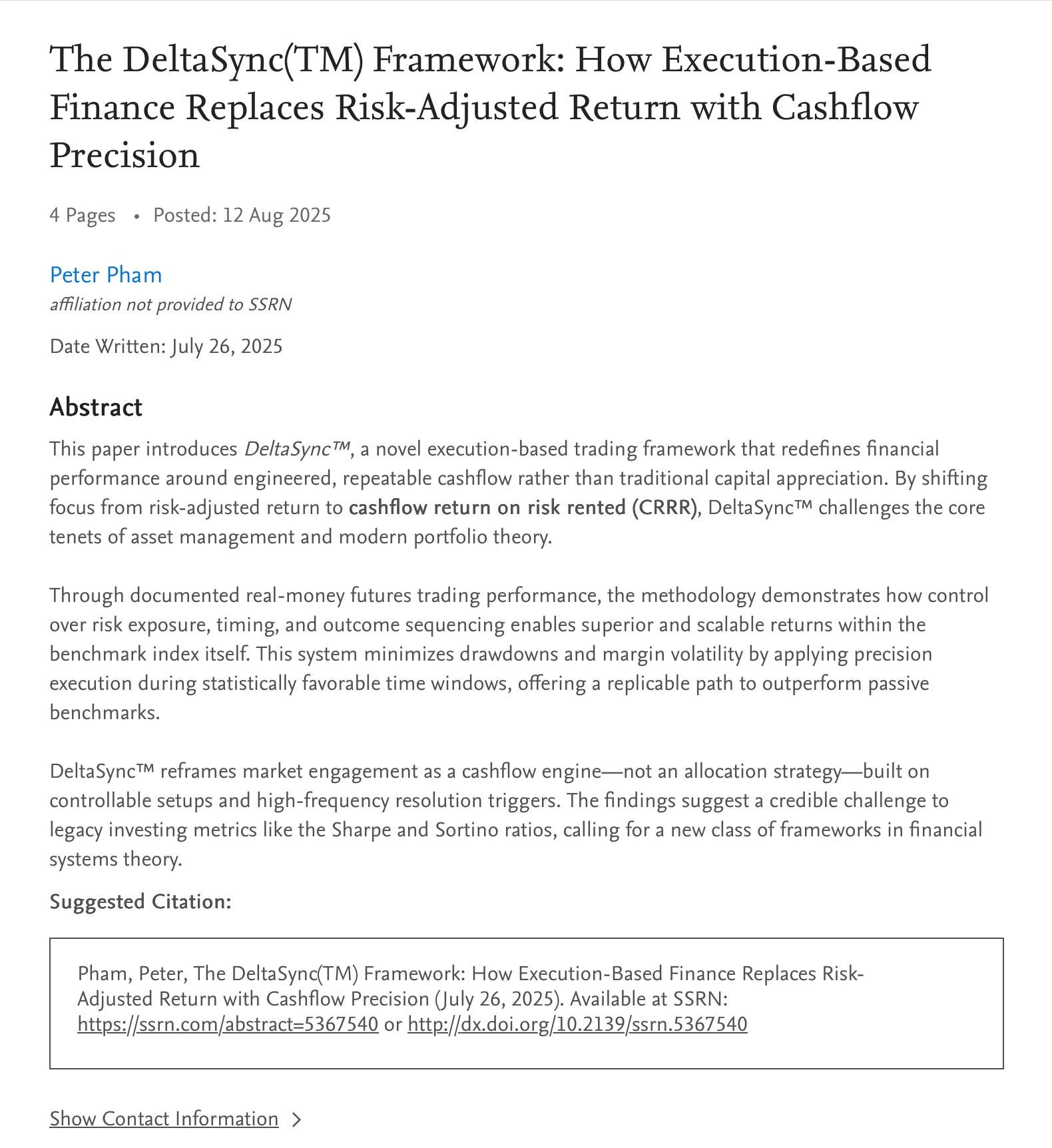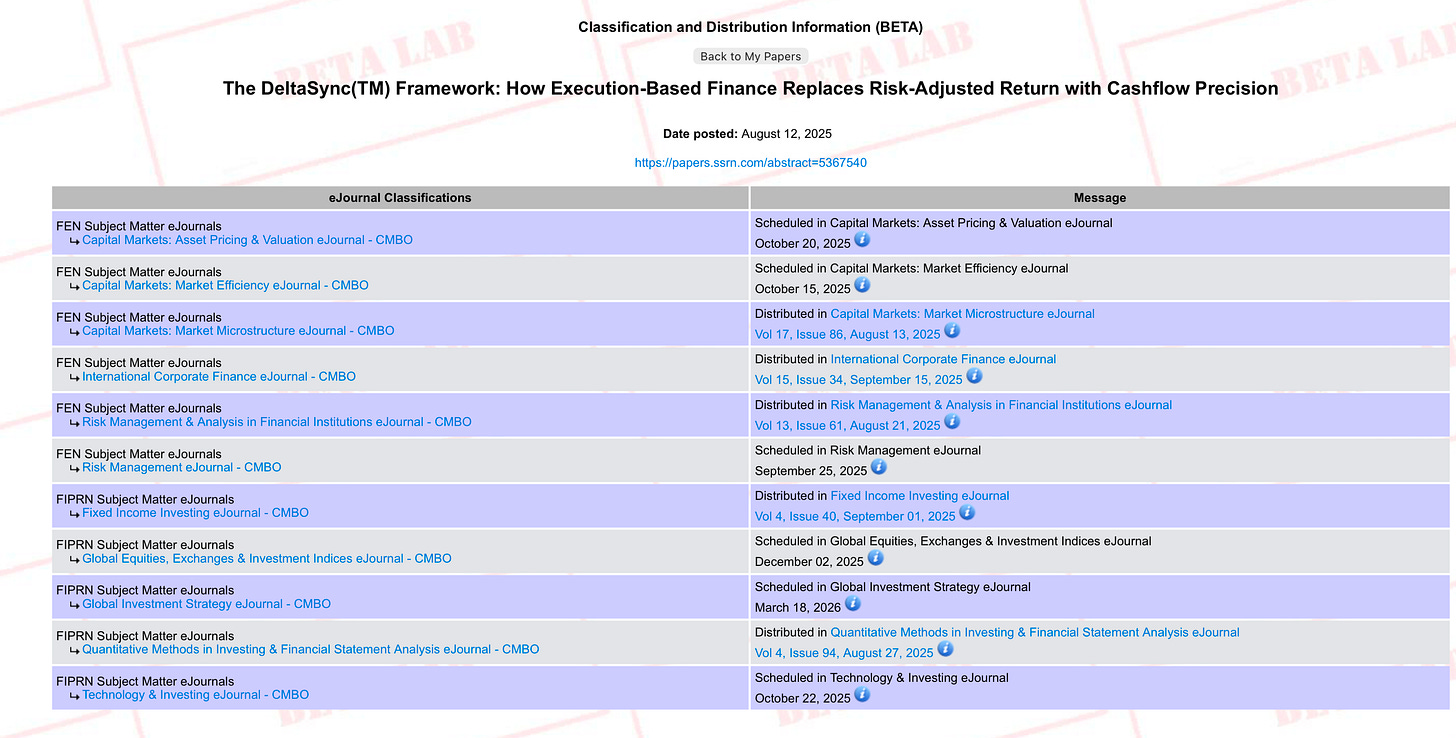 My paper, The DeltaSync™ Framework: How Execution-Based Finance Replaces Risk-Adjusted Return with Cashflow Precision, has already: