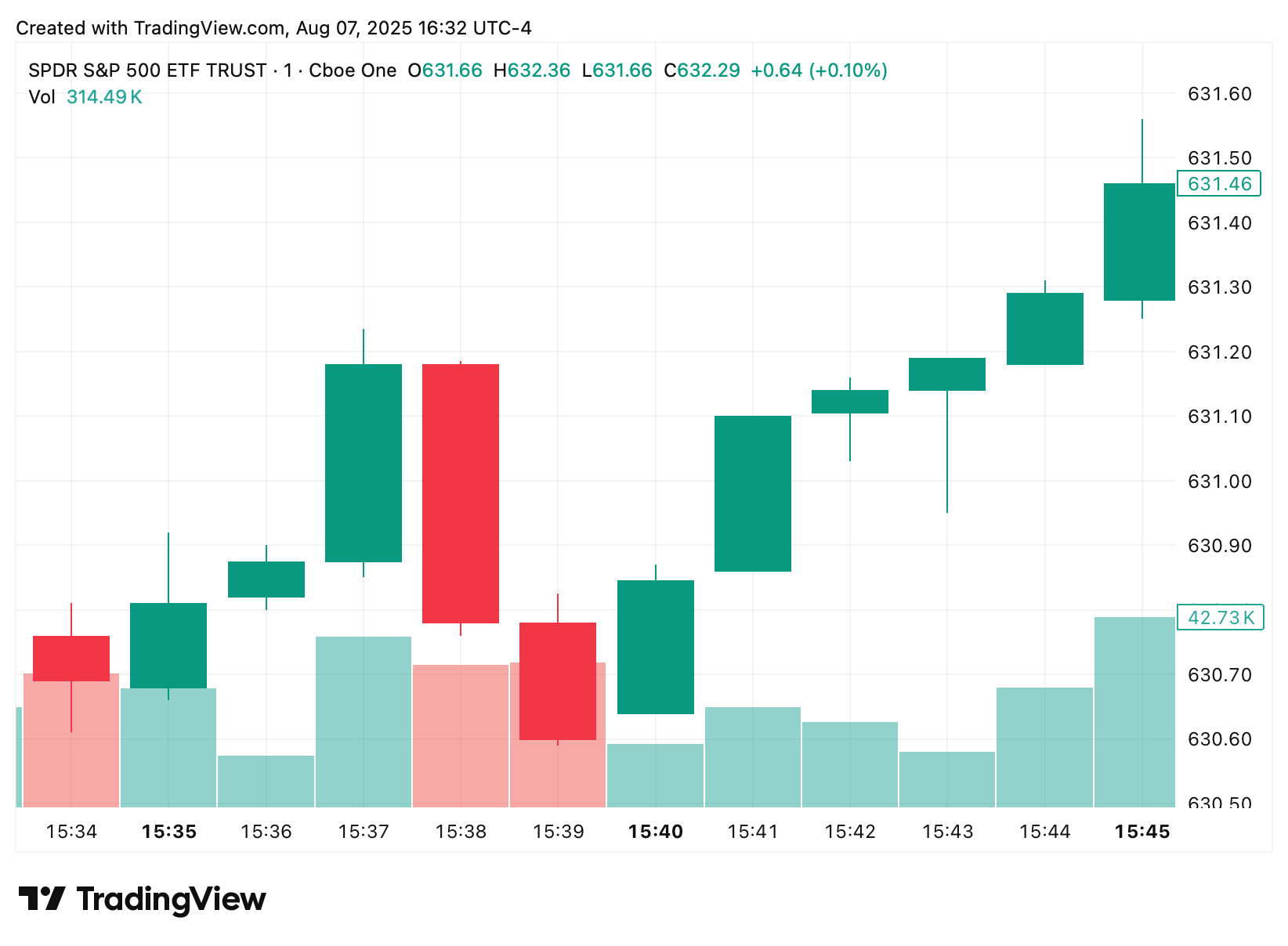 All day, volume and price were de-linked — small spurts, then stalls. But starting at 3:35 PM, three things occurred at once, which almost never synchronize this tightly without intervention: