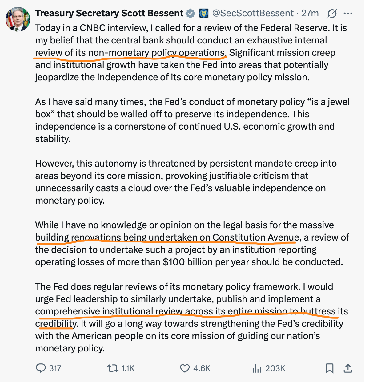 Or calls to “audit the Fed’s non-monetary operations”—a red herring dressed in libertarian robes, carefully designed to keep you chasing shadows.