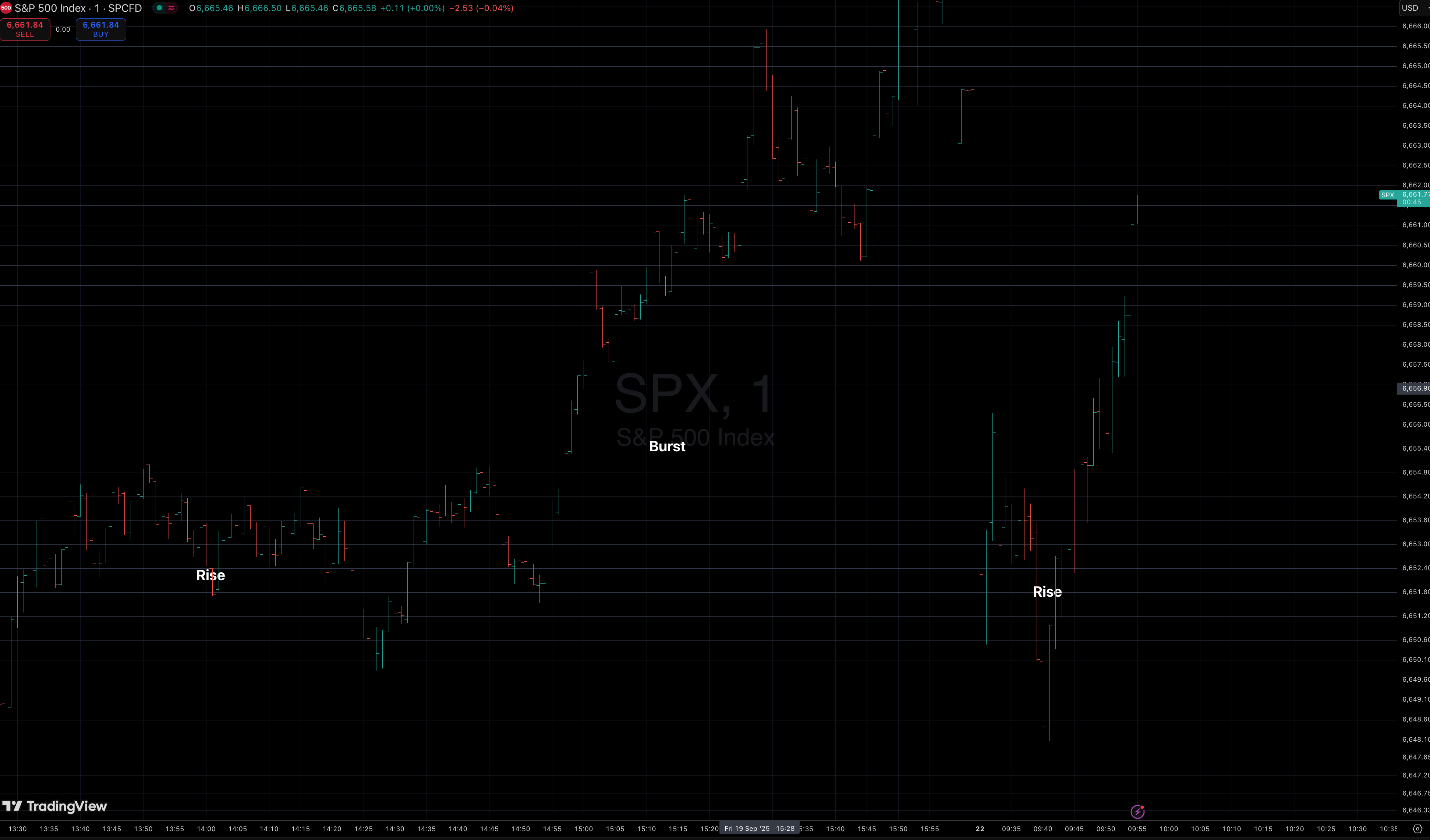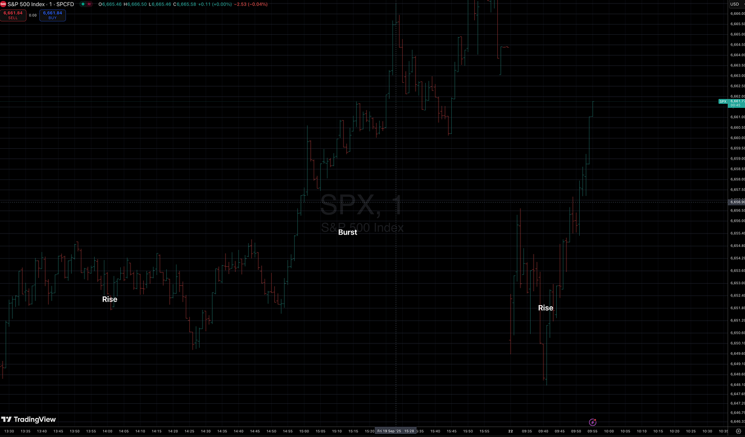 Today, the tape replayed the same structure. Another Rise — this time from a lower base — resolved higher with the same burst DNA.