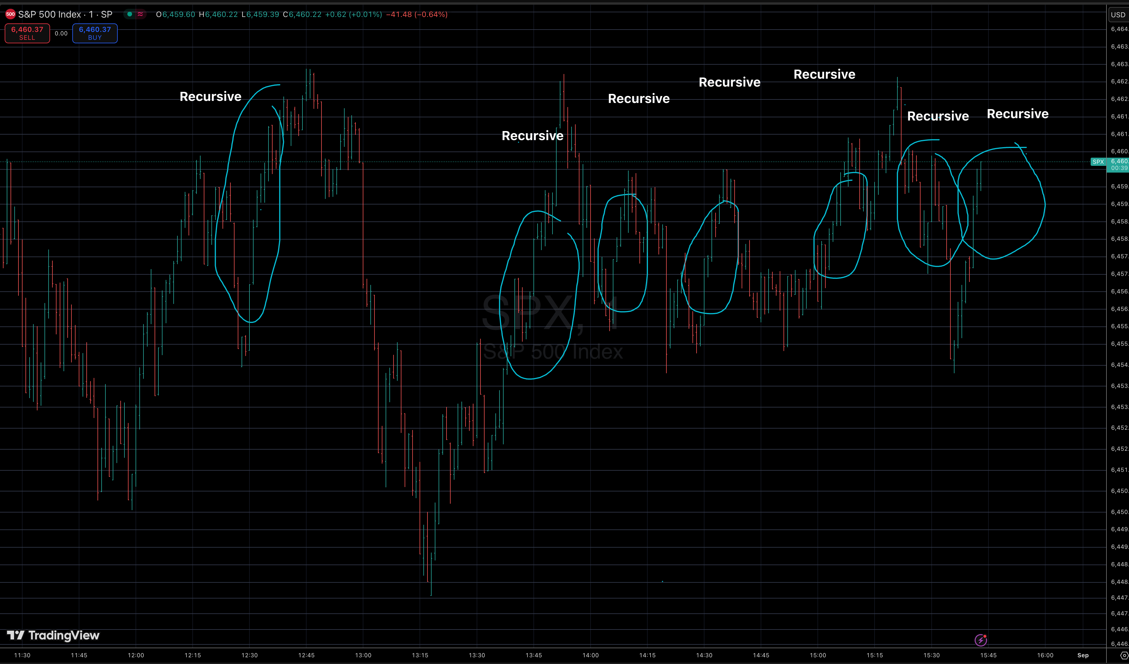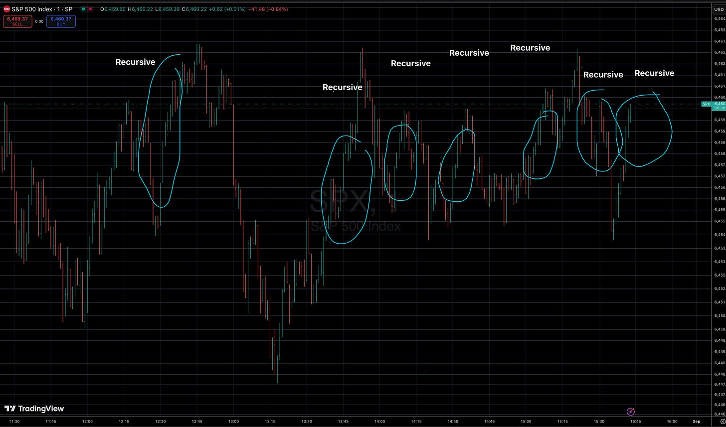 What you’re seeing in this chart isn’t randomness — it’s evidence of entrenchment. I anchored the low, authored the burst, and the market didn’t just react once. It kept replaying the authored structure — bar-for-bar, wick-for-wick — at the exact same price level, over and over 8x. That kind of recursion is the system admitting my imprint.