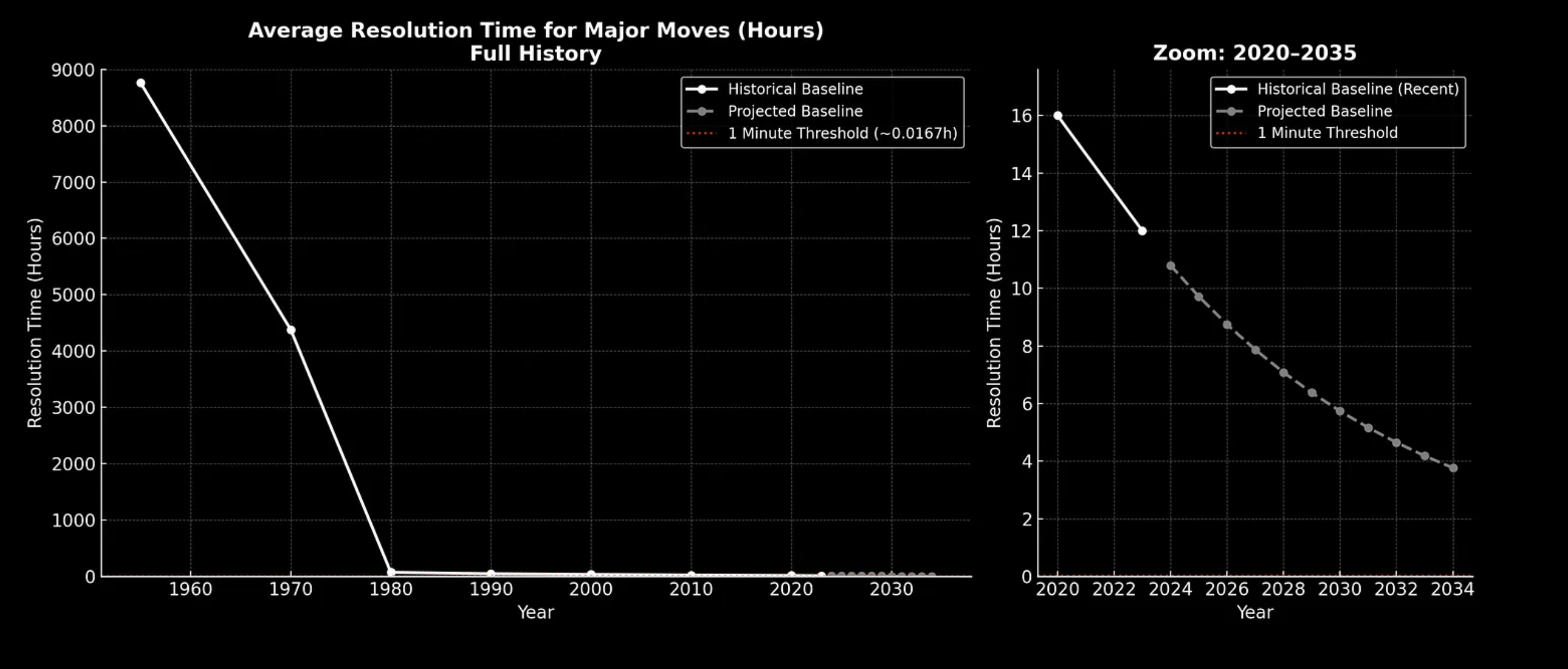 By 2028–2030, median resolution <1 hour; outliers in seconds.