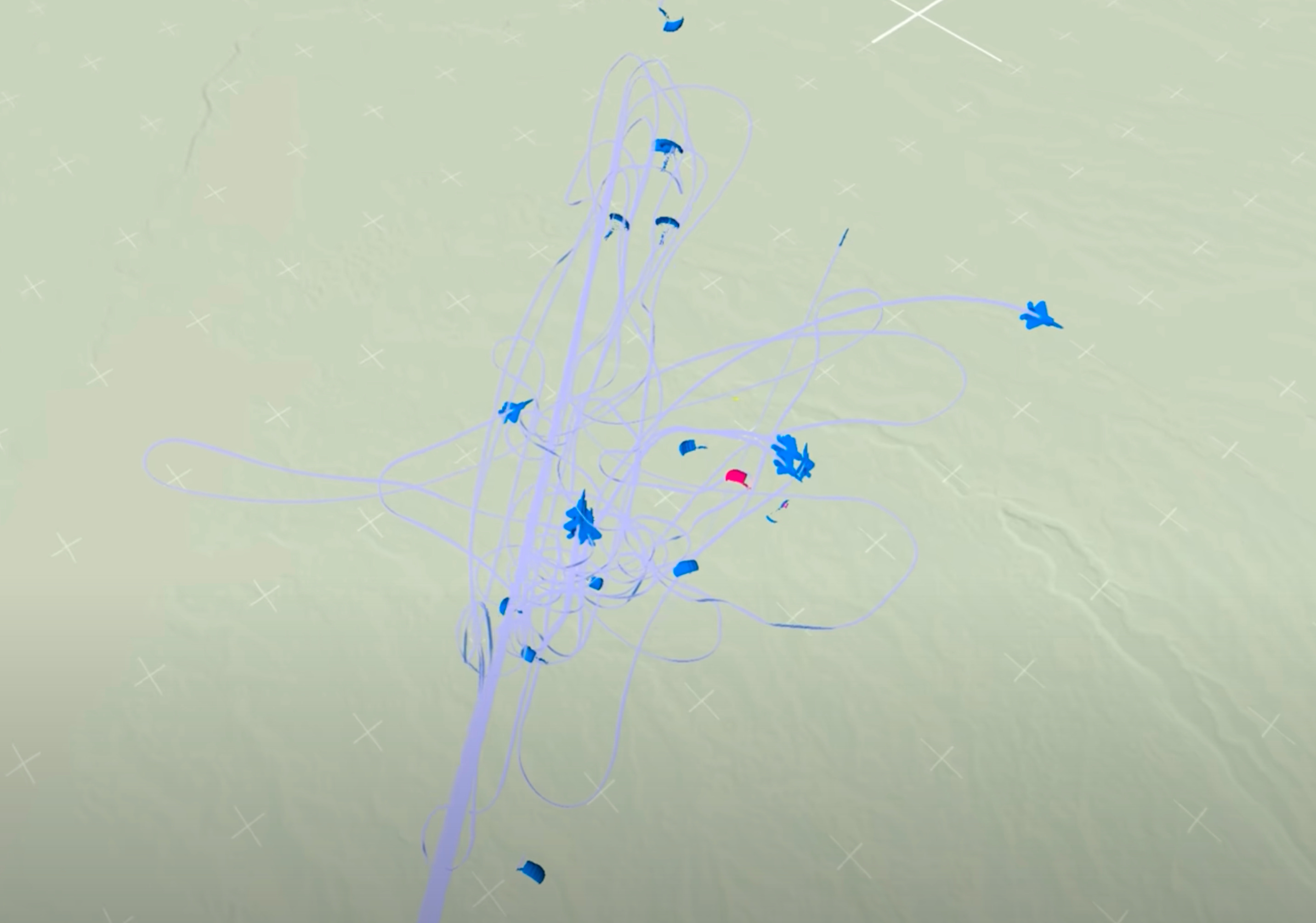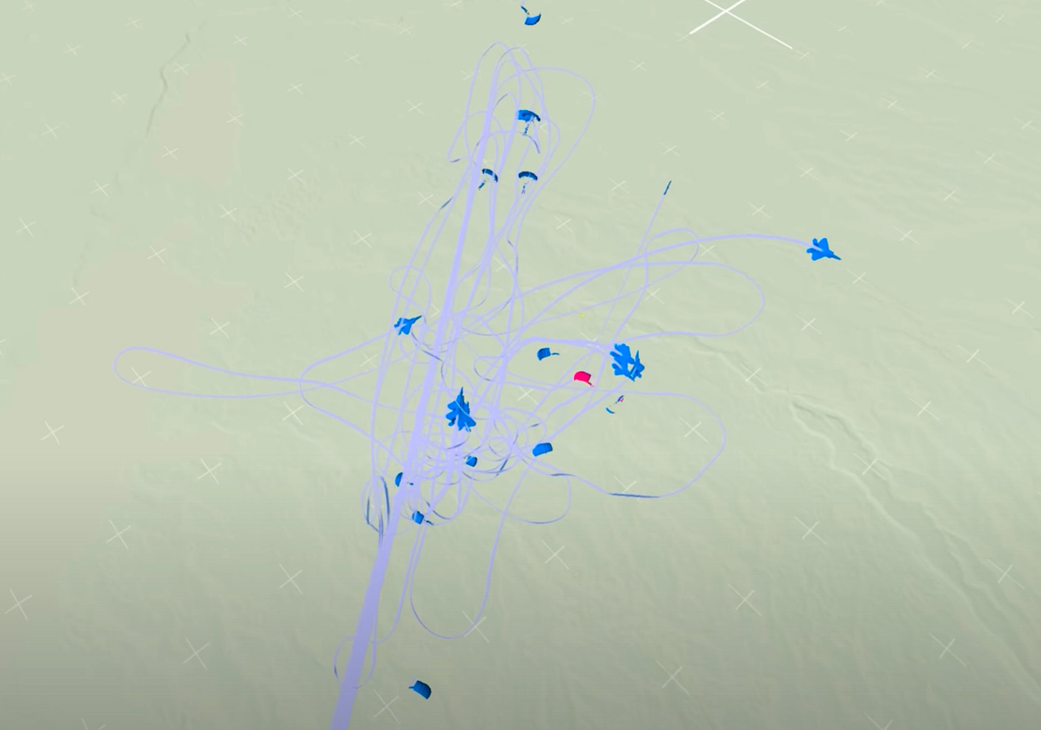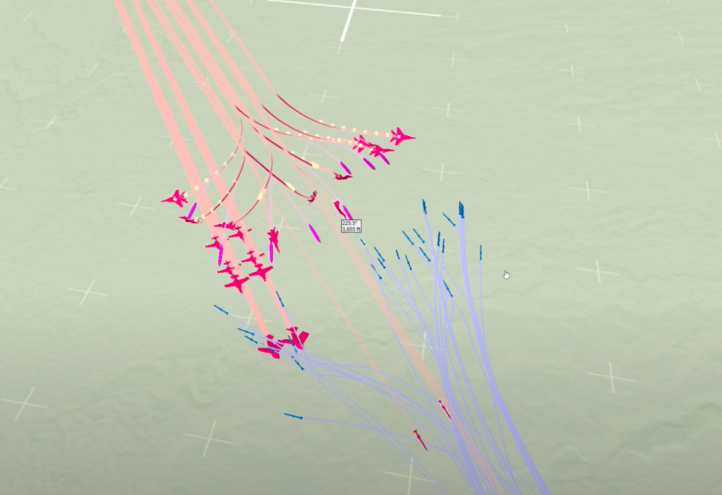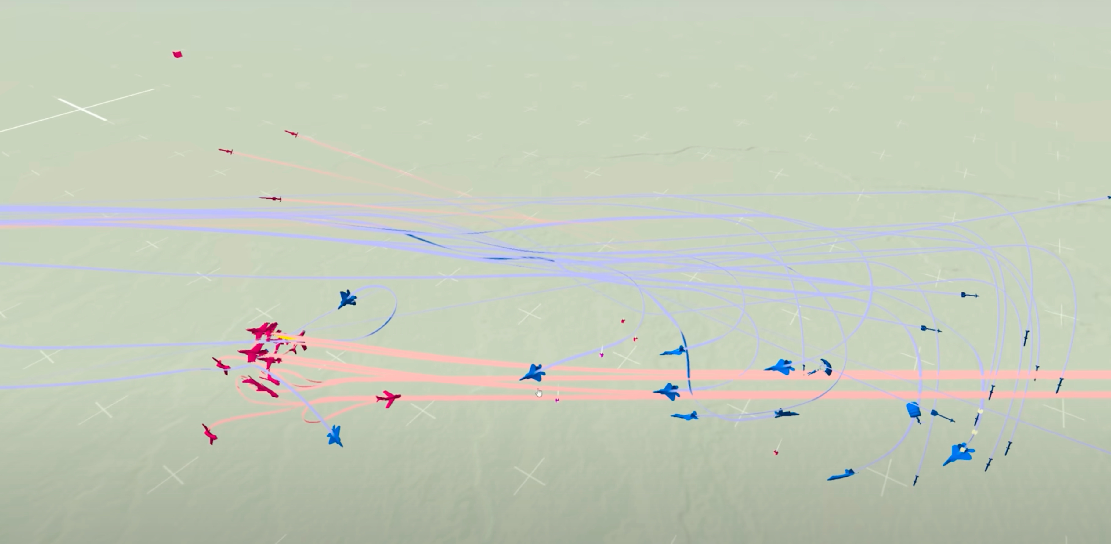 Mid-engagement: Chaos. Reds scatter into disconnected tracks.