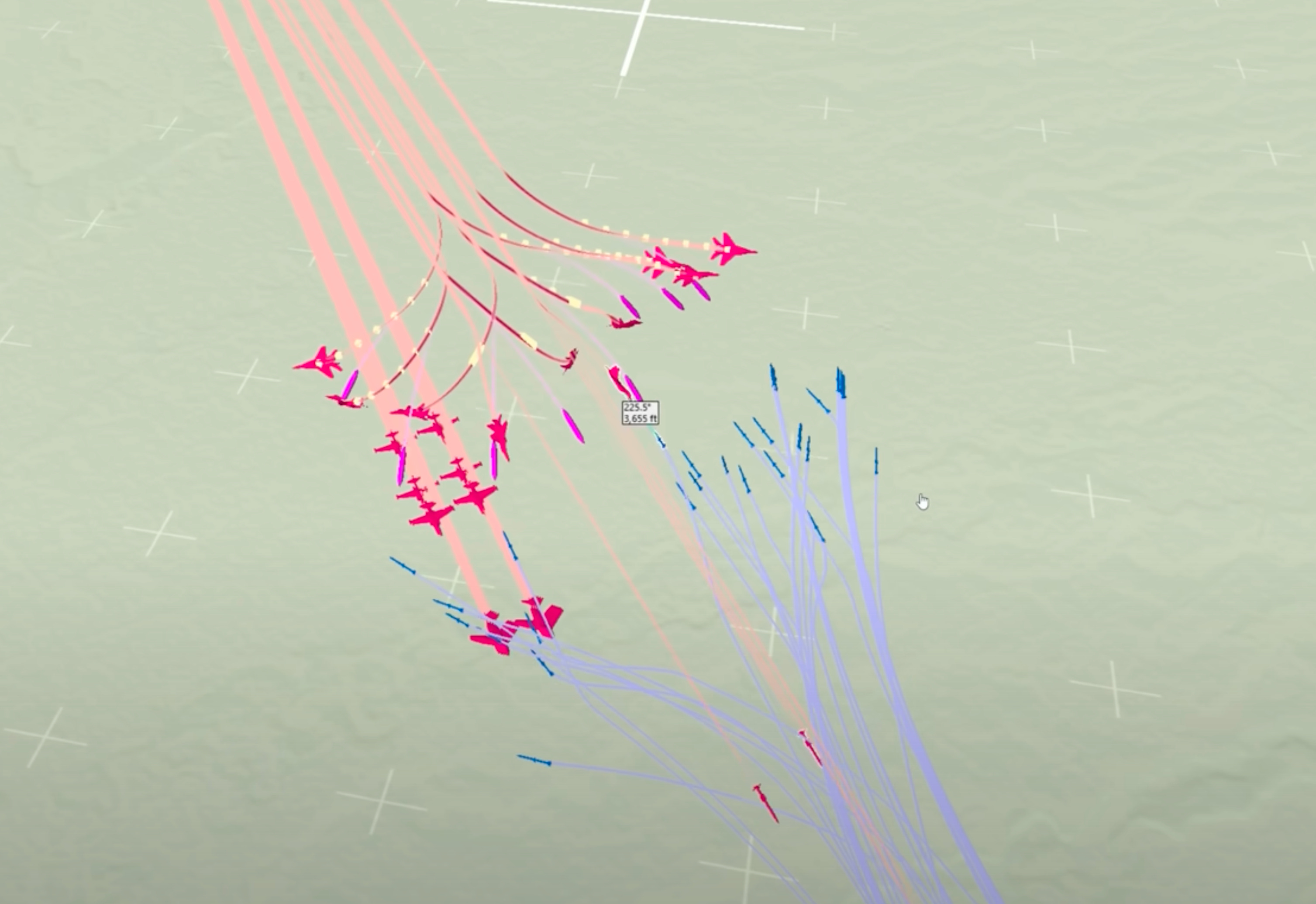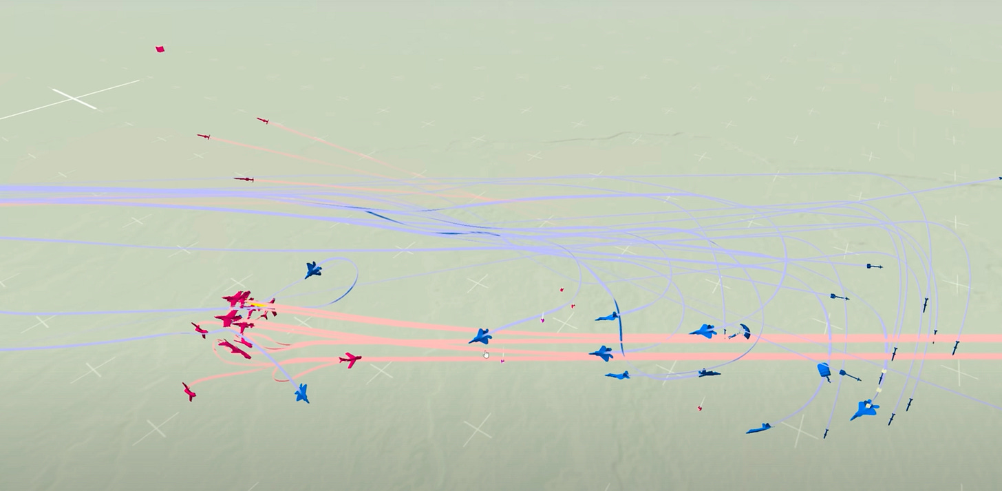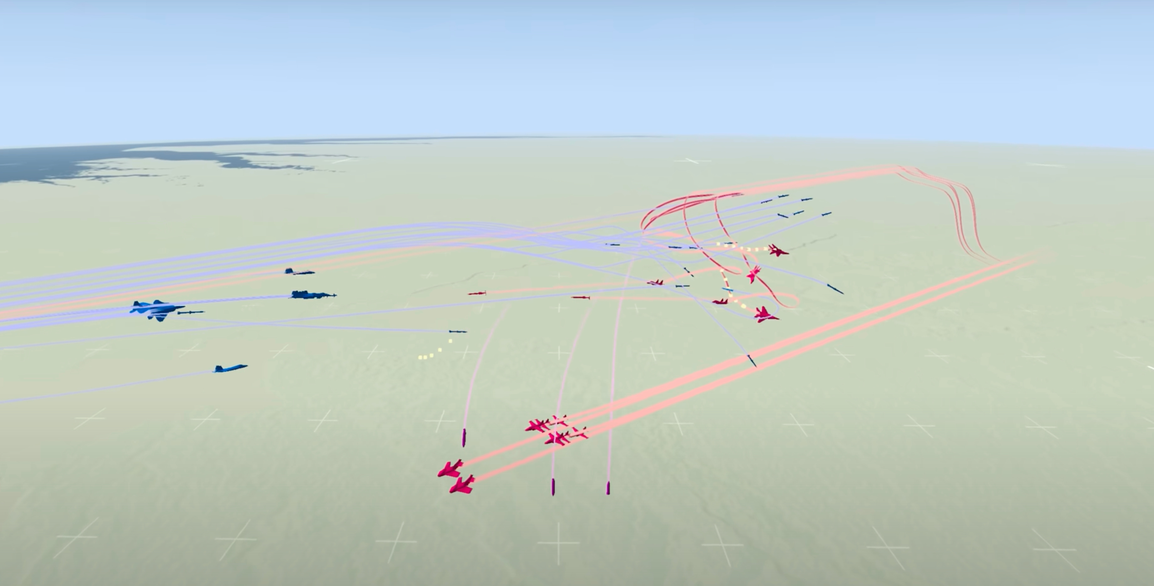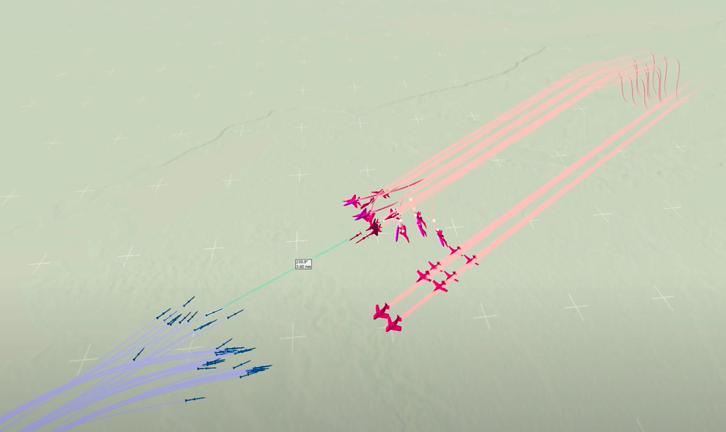 First volley: Blue F-22s fire from beyond range. The red formation fractures instantly.