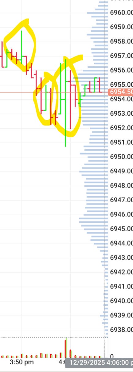 The final rise at 3:59, into the close, was the only one that mattered for resolution. By then, prior micro-rises had already conditioned price, absorbed opposing flow, and compressed variance.