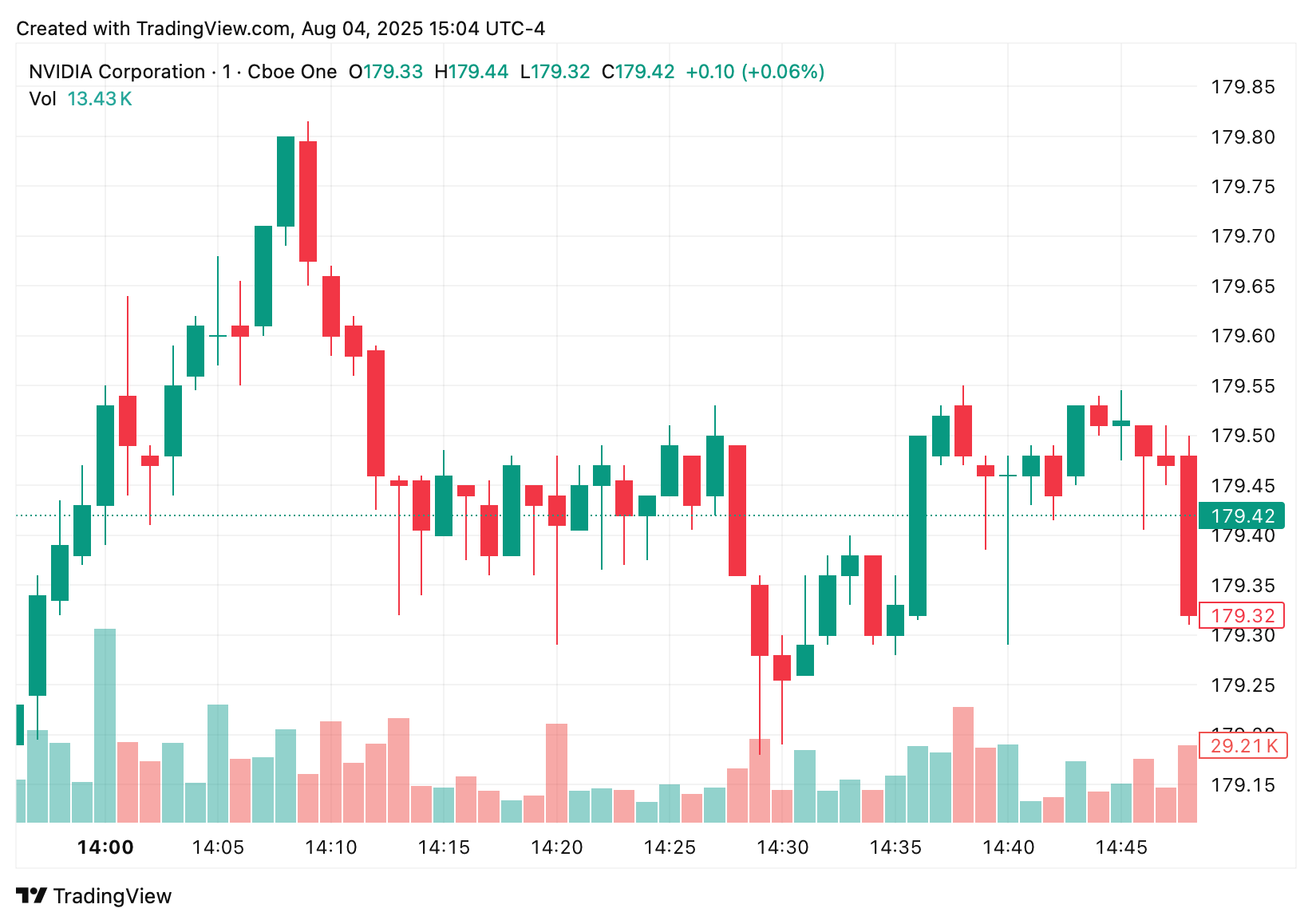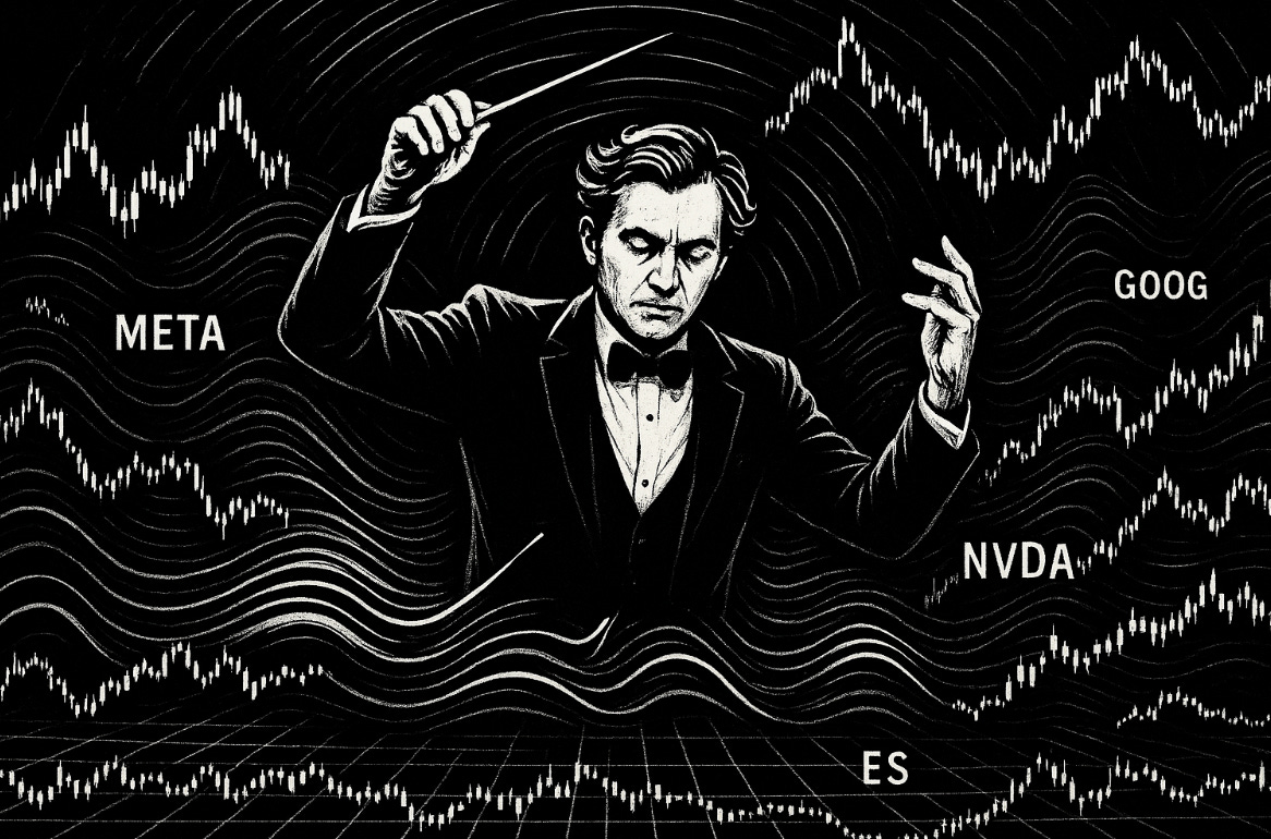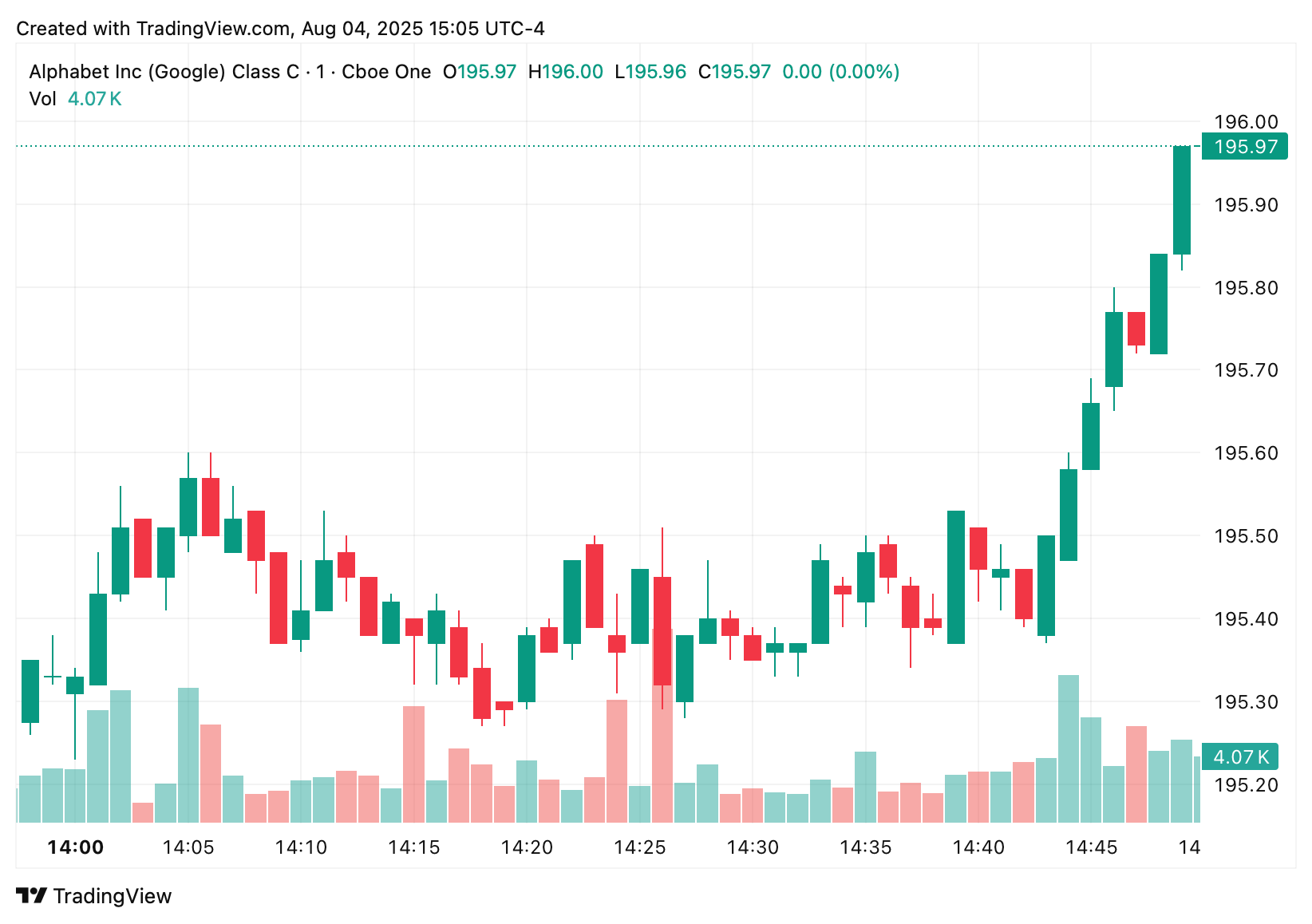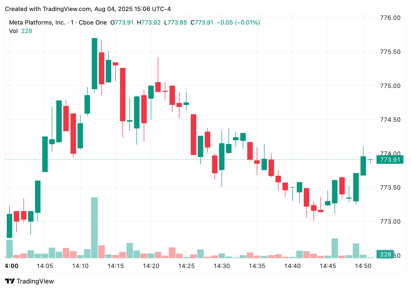 As the E-mini S&P regained its footing, large-cap leaders across the tech ecosystem began responding. NVIDIA reversed from a local trough and surged into 2:10 PM before stalling. Alphabet (GOOG) climbed steadily, printing a high just minutes after the ES firmed. Meta (META) — like a lagging echo — slowly rotated upward before pausing just before 2:50 PM.